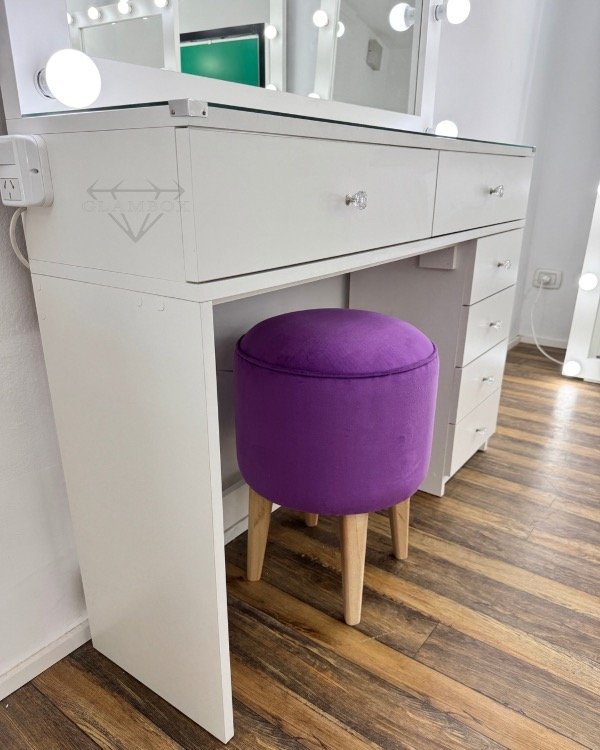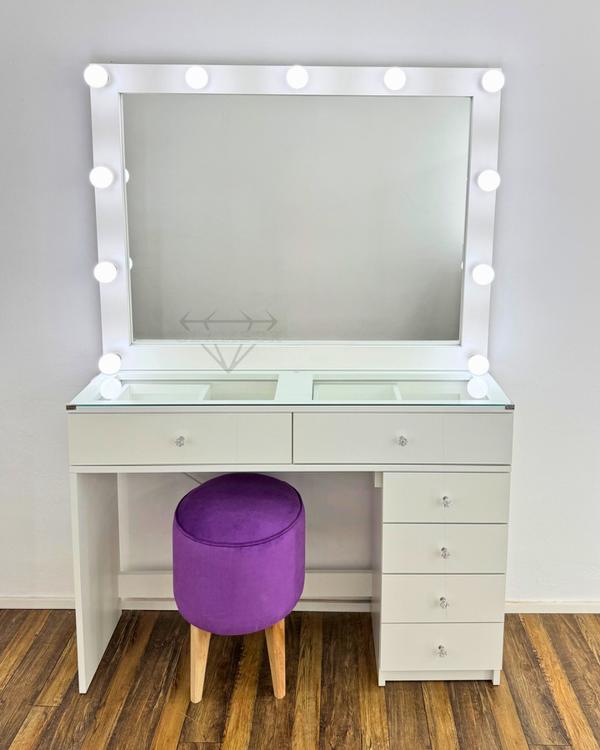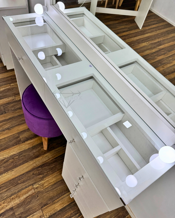 Mueble realizado en melamina compuesto del espejo con marco para luces, 2 cajones a la vista con divisiones y bandeja móvil, vidrio de 4 mm, 2 patas: lateral hasta el piso y cajonera de cuatro cajones en el otro lateral.