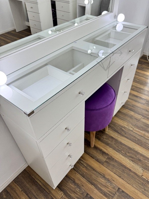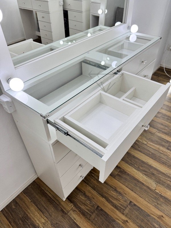 Mueble realizado en melamina compuesto del espejo con marco para luces, dos cajones a la vista con divisiones y bandeja móvil (vidrio de 5mm sobre la mesa), y dos cajoneras de cuatro cajones cada una.