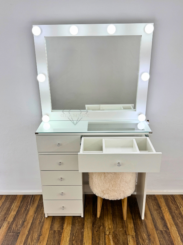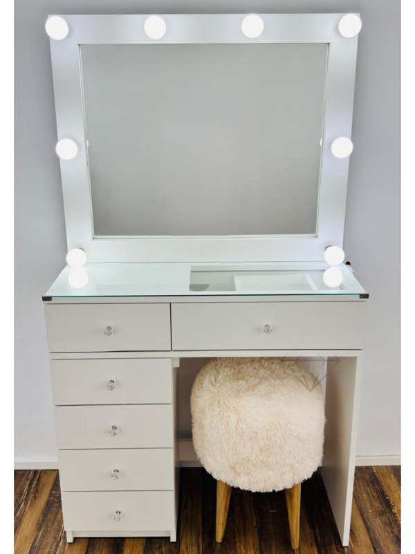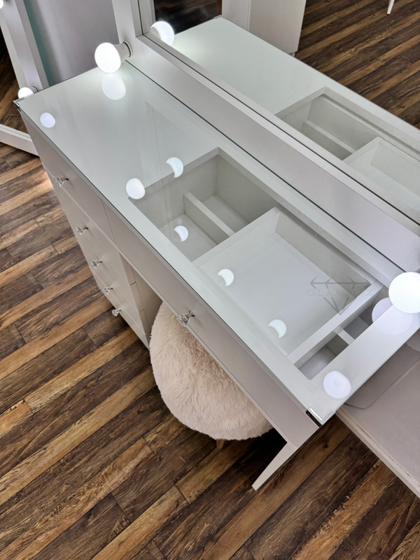 Mueble realizado en melamina compuesto del espejo con marco para luces, cajón doble con un cajón a la vista con divisiones y bandeja móvil, vidrio sobre la mesa, patas compuestas de un lateral hasta el piso y una cajonera de cuatro cajones en el otro lateral.